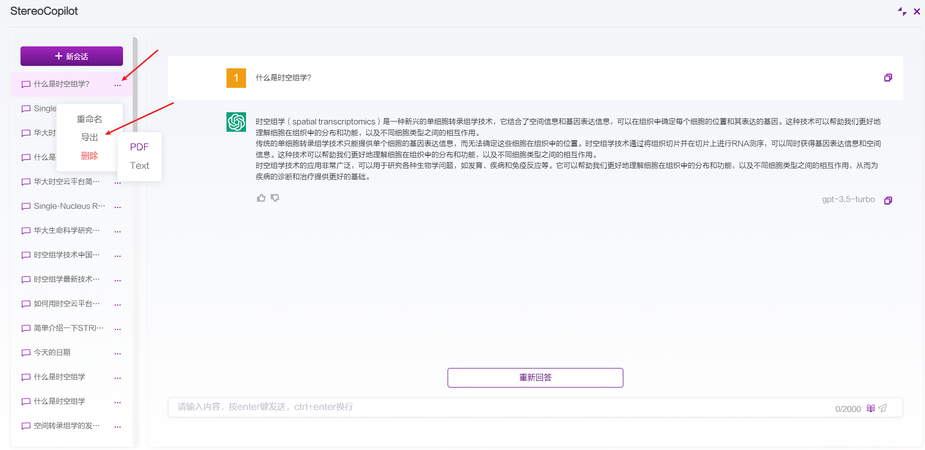 单击会话旁的“...”,鼠标经过导出按钮,可将该会话导出为pdf或者text: