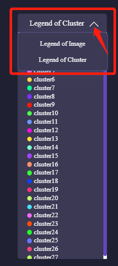 Cluster图层下,默认展示聚类图例,当有图像图层或基因/蛋白multi-colored图存在时,也可手动切换至图像图例。