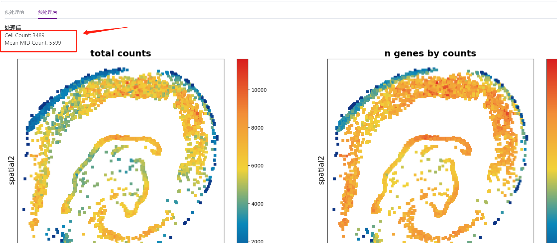 在PR任务下,查看预处理后的结果时,支持显示细胞数和平均MID数进行过滤前后的数值对比。