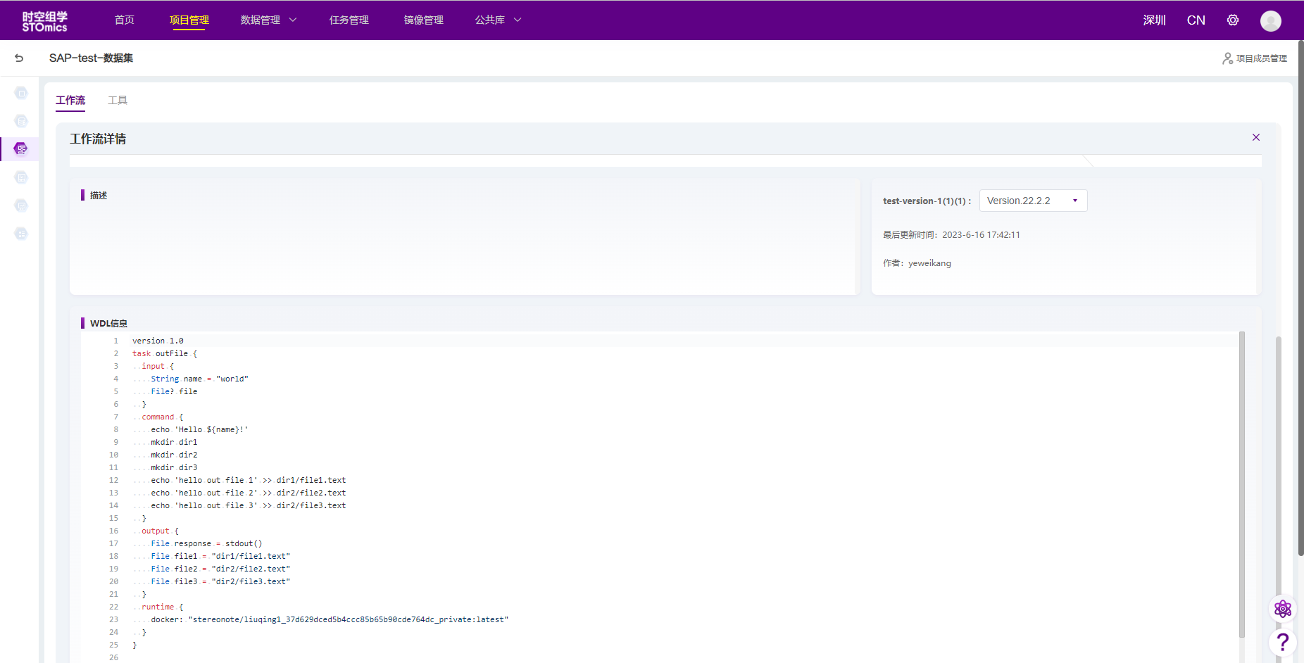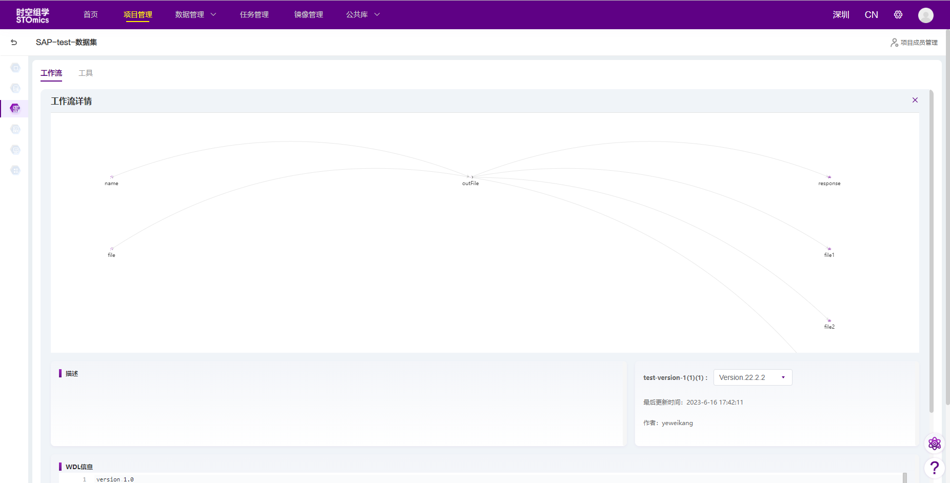 点击工作流卡片的按钮,进入工作流详情界面,展示预览图与WDL代码