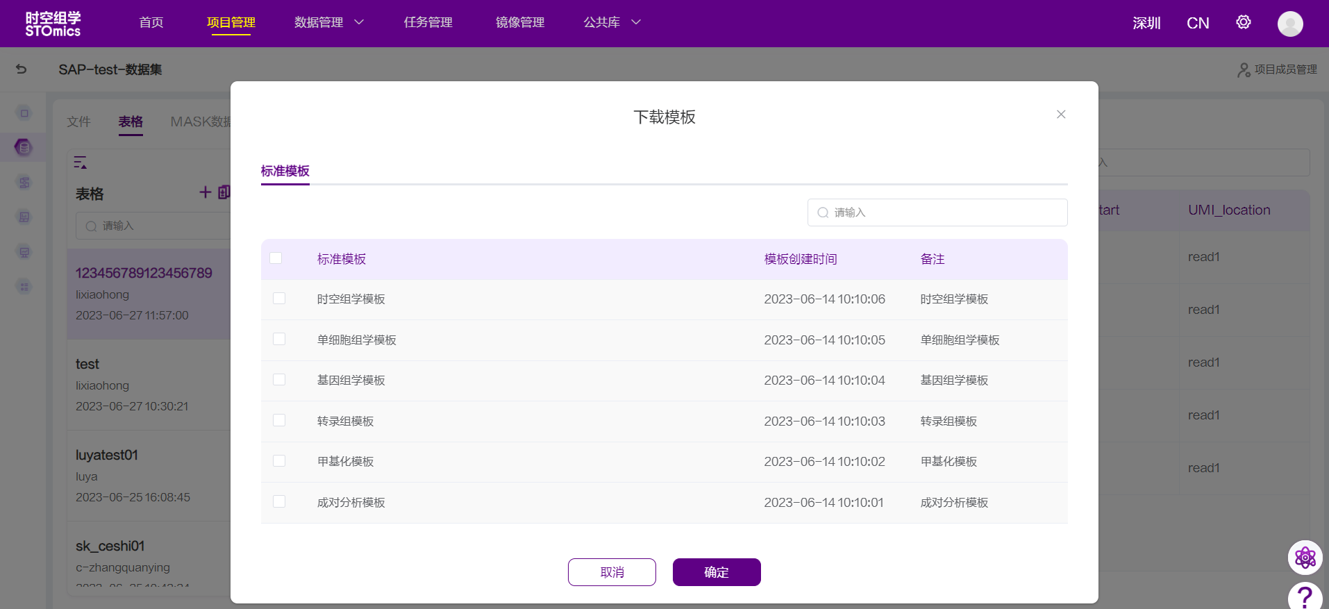 用于下载表格模板。点击该按钮后,弹出模板下载框(如下图),选择需要的模板后点击按钮【确定】即可下载Excel格式的模板。模板中有两个sheet,其中sheet1用于填写信息,example为示例数据。