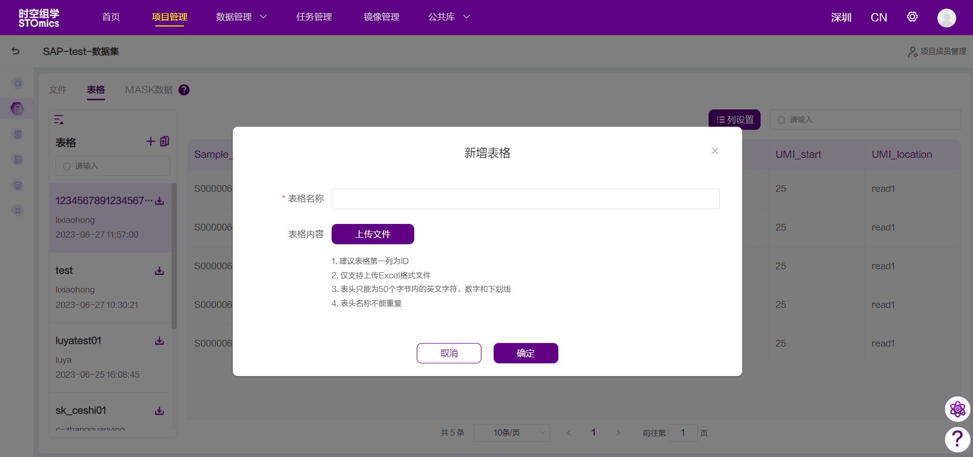 用于新增表格。点击该按钮后,弹出新增表格对话框,填写表格名称,选择需要上传的文件后,点击按钮【确定】即可成功上传文件。