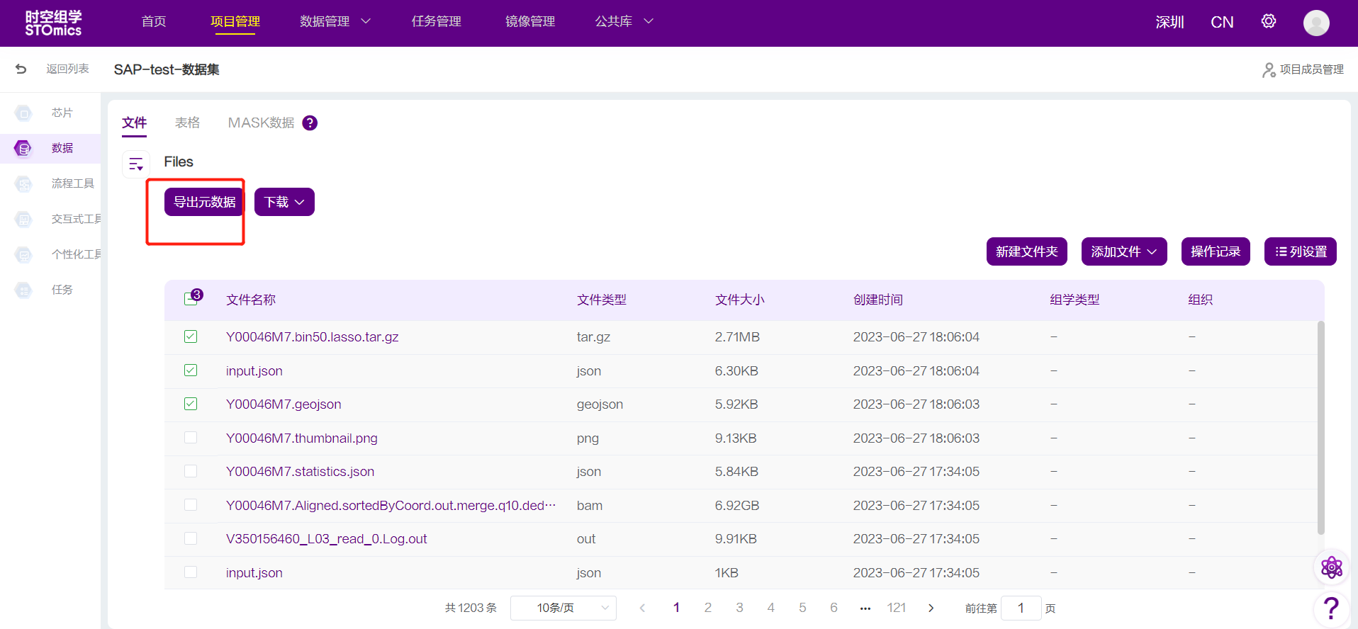 进入数据管理-文件页面后,选择一个或多个文件,点击按钮【导出元数据】即可,如下图: