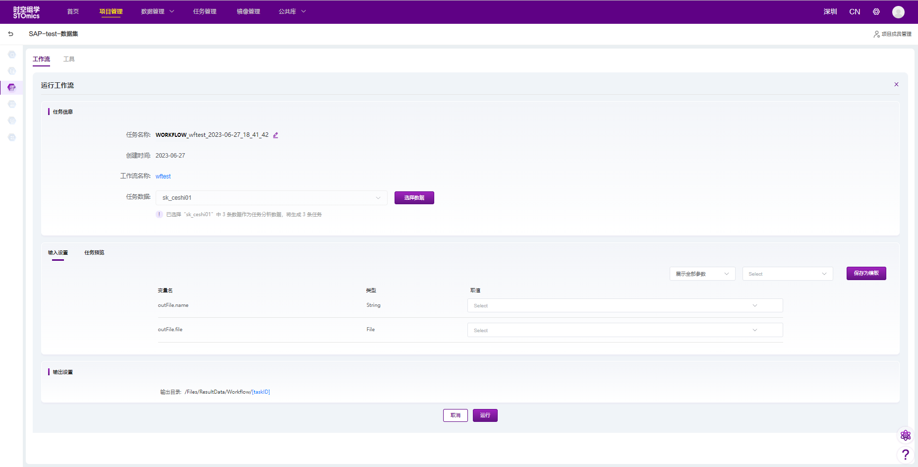 点击工作流卡片的【运行】按钮,进入任务投递参数设置的界面。
