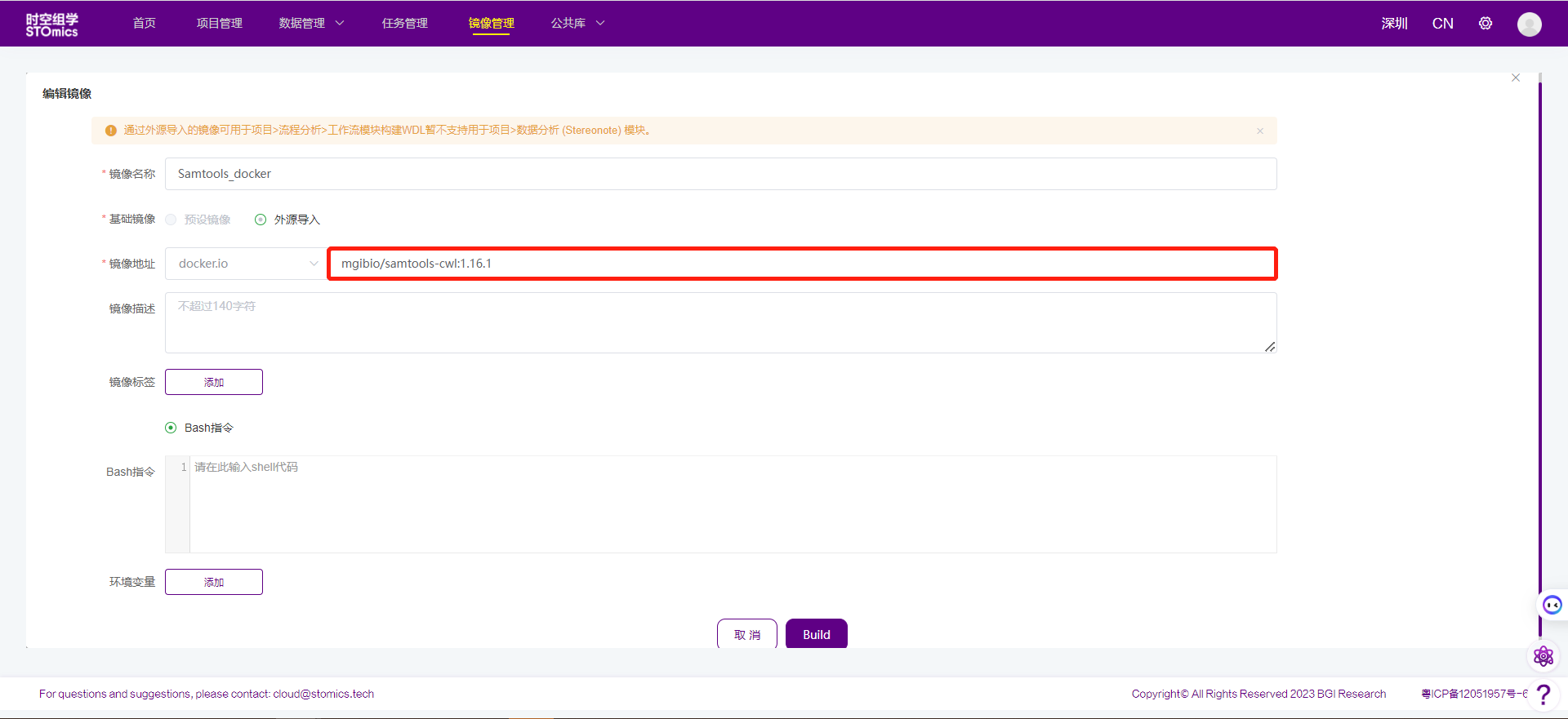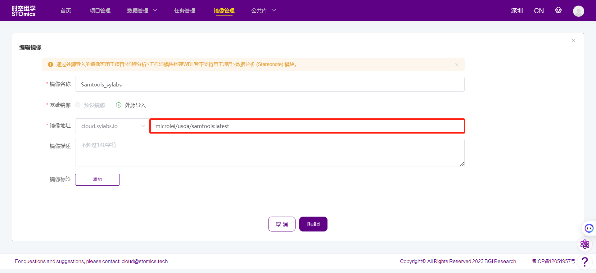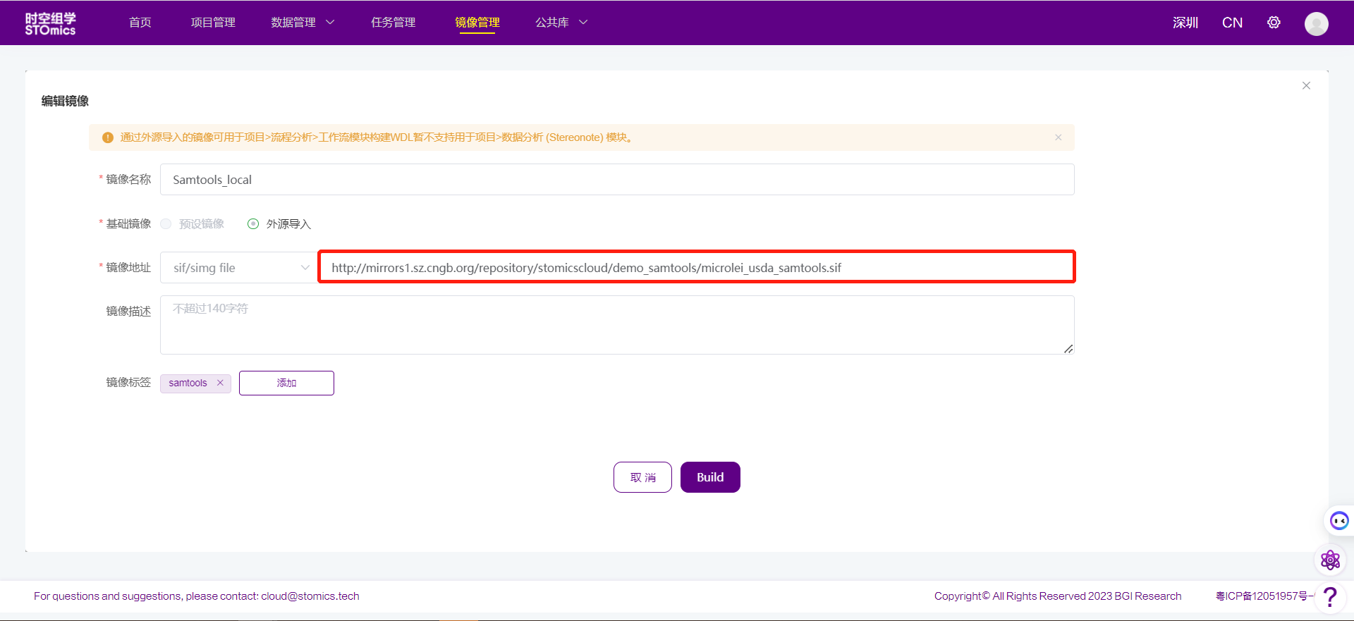 Step4:登录DCS Cloud,在镜像管理构建镜像时选择“外源导入>sif/simg file”方式。输入“http://mirrors1.sz.cngb.org/repository/stomicscloud/+镜像地址直接构建。
